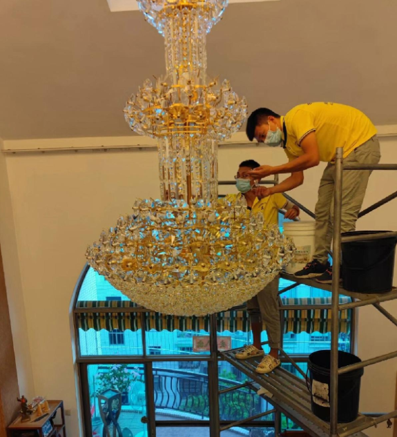 (一)前期拆卸1、準(zhǔn)備工具:一般情況下,我們家中客廳、餐廳安裝的水晶吊燈都是小型的,可以拆卸清洗!我們需要準(zhǔn)備的工具有:手套、梯子、清水、軟毛刷子、天那水、水晶燈專用清潔劑或者煤油。2、拆卸水晶珠串:拆卸前,我們需切斷燈具電源,防止觸電;在水晶燈的下方墊一塊海綿墊,防止水晶珠串拆卸時(shí)掉落損壞;拆卸時(shí),由于客廳餐…